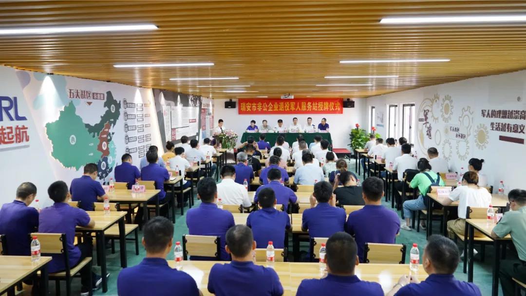 7月31日,瑞安市非公企業(yè)退役軍人服務(wù)站授牌儀式在瑞立集團(tuán)舉行。溫州市退役軍人事務(wù)局黨組書記、局長阮云富,瑞安市副市長林增豐為華峰集團(tuán)、瑞立集團(tuán)、通力集團(tuán)等14家非公企業(yè)退役軍人服務(wù)站集中授牌。瑞安市退役軍人事務(wù)局局長徐軍凱主持授牌儀式。瑞安市退役軍人服務(wù)中心主任賈起,瑞立集團(tuán)董事長張曉平、執(zhí)行總經(jīng)理余錦瑞、黨委書記陳康進(jìn),23個鄉(xiāng)鎮(zhèn)服務(wù)站站長,14家企業(yè)單位代表及退役軍人代表等70多人出席。