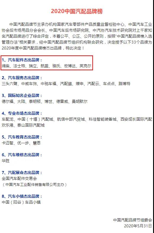 高質量發展 與濰柴、博世等一起入圍中國汽配品牌榜杰出品牌