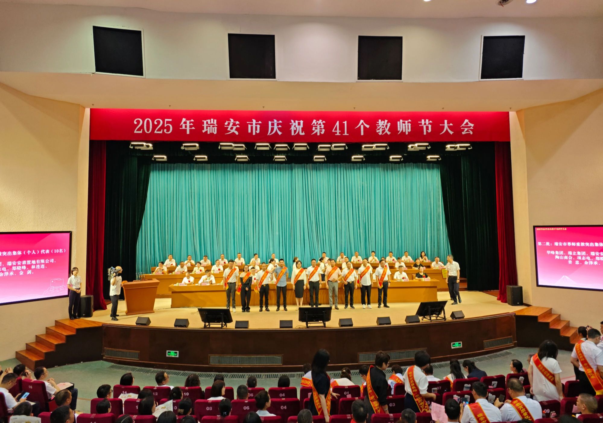 9月9日上午,瑞安市慶祝第41個(gè)教師節(jié)大會(huì)在市政會(huì)議中心大禮堂舉行。瑞安市委書記李堅(jiān)出席會(huì)議并作重要講話。瑞立集團(tuán)董事長張曉平受邀出席大會(huì)并在主席臺(tái)就座,與相關(guān)部門領(lǐng)導(dǎo)、中小學(xué)校長、幼兒園園長、優(yōu)秀教師代表等歡聚一堂,向全市廣大教育工作者致以節(jié)日祝福。